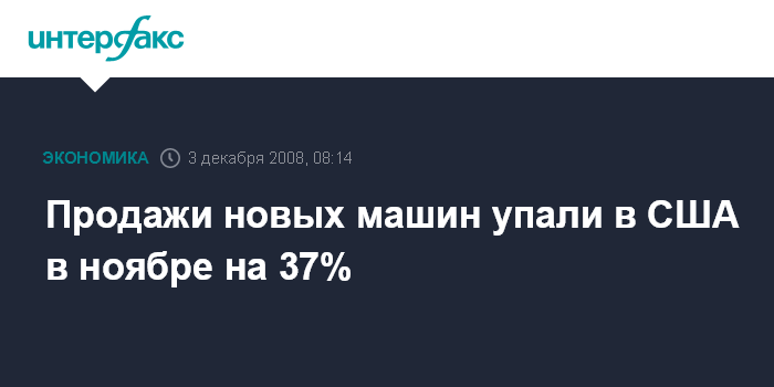 Москва. 3 декабря. INTERFAX.RU - Продажи новых автомашин в США под воздействием кризиса в американской экономике упали в ноябре до самого низкого за последние 26 лет уровня, снизившись на 37% по сравнению с тем же месяцем прошлого года, свидетельствуют данные исследовательской компании Autodata.