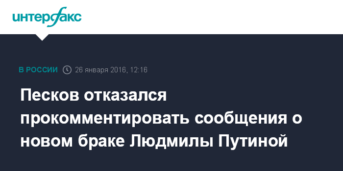 Москва. 26 января. INTERFAX.RU - Пресс-секретарь президента РФ Дмитрий Песков отказался прокомментировать журналистам сообщения в СМИ, что бывшая супруга президента Людмила вышла замуж.