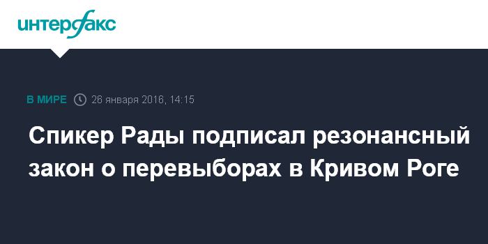 Москва. 26 января. INTERFAX.RU - Спикер Верховной рады Украины Владимир Гройсман подписал закон о проведении внеочередных выборов городского головы Кривого Рога (Днепропетровская область) 27 марта 2016 года.