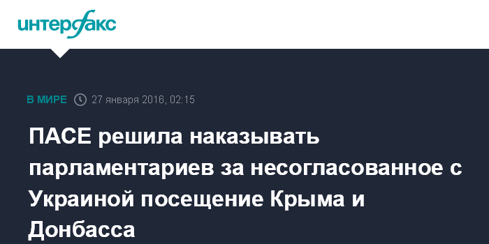 Москва. 27 января. INTERFAX.RU - Парламентская ассамблея Совета Европы приняла резолюцию, согласно которой европейские парламентарии будут нести ответственность за посещение Крыма и Донбасса в обход украинских законов, заявил заместитель председателя украинской делегации в ПАСЕ, народный депутат от фракции "Народный фронт" Георгий Логвинский.