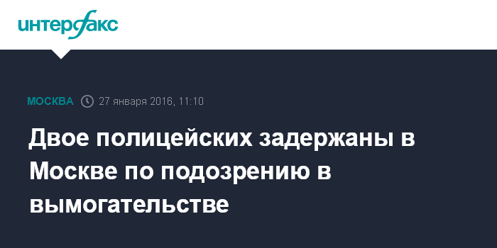 Москва. 27 января. INTERFAX.RU - Капитан и старший лейтенант полиции задержаны в центре Москвы по подозрению в вымогательстве почти миллиона рублей у жительницы столицы за то, чтобы избежать привлечения к уголовной ответственности, сообщил "Интерфаксу" в среду источник в правоохранительных органах.