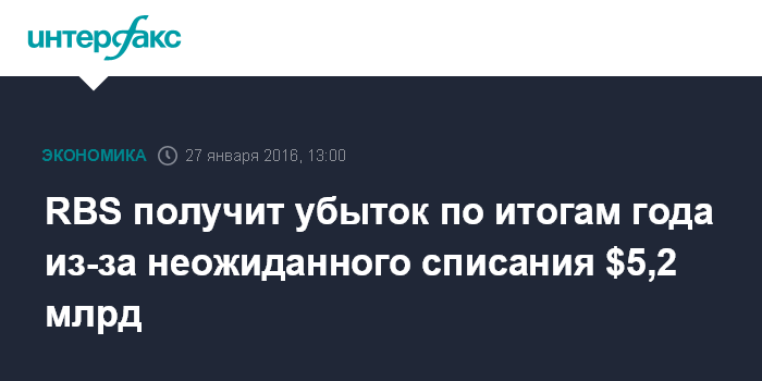 Москва. 27 января. INTERFAX.RU –Royal Bank of Scotland, 73% акций которого принадлежат правительству Великобритании, прогнозирует убыток по итогам 2015 года после неожиданного списания стоимости активов на 3,6 млрд фунтов стерлингов ($5,2 млрд) из-за различных выплат в четвертом квартале.