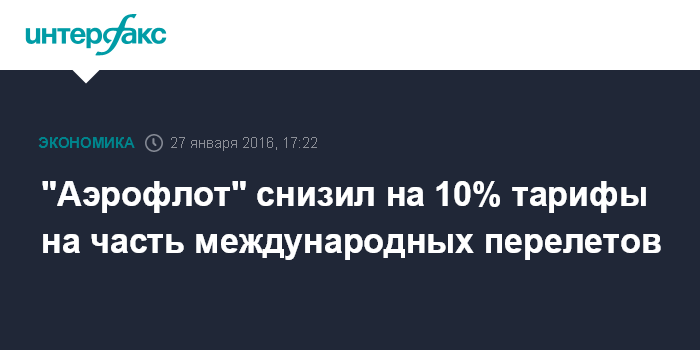 Москва. 27 января. INTERFAX.RU – "Аэрофлот" снизил на 10% тарифы, номинированные в евро, на часть своих международных перелетов, сообщил перевозчик в среду.