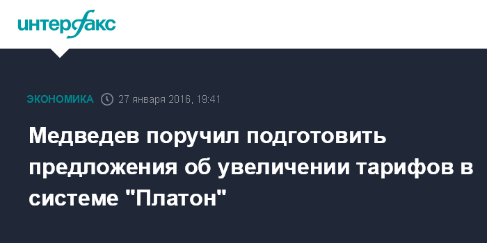 Москва. 27 января. INTERFAX.RU - Премьер-министр Дмитрий Медведев поручил Минтрансу, Минэкономразвития и Минфину к 10 февраля представить в правительство согласованные предложения по сроку увеличения размера платежей, взымаемых с грузовиков массой свыше 12 тонн.