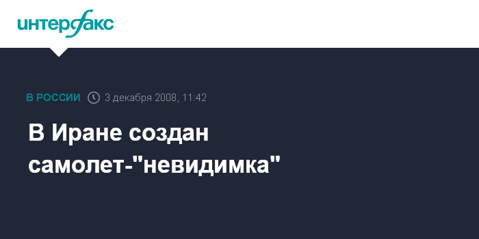 Москва. 3 декабря. INTERFAX.RU - Самолет-"невидимку" удалось создать иранским ученым, сообщает во вторник иранский телеканал "Пресс-ТВ", цитируя командующего ВВС Ирана Хасана Шах-Сафи.