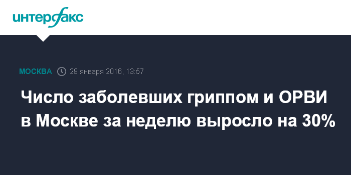 Москва. 29 января. INTERFAX.RU - Прирост заболеваемости ОРВИ и гриппом в Москве за неделю составил 30%, заявил в пятницу первый заместитель руководителя департамента здравоохранения столиы Николай Потекаев.