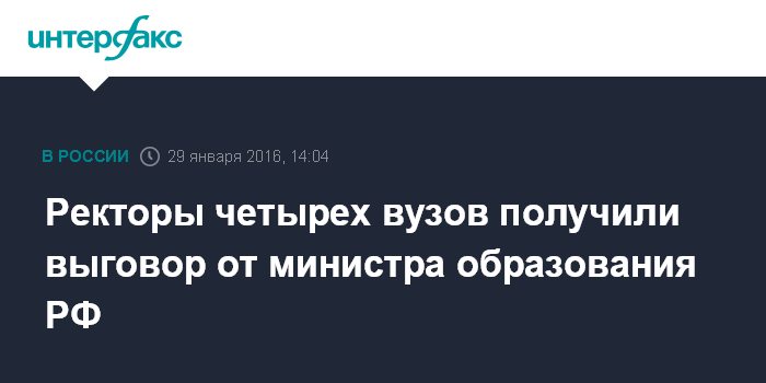 Москва. 29 января. INTERFAX.RU - Министр образования и науки РФ Дмитрий Ливанов объявил выговор ректорам четырех региональных вузов за задержку студенческих стипендий, сообщила "Интерфаксу" пресс-секретарь министра Анна Усачева.