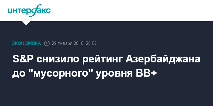 Москва. 29 января. INTERFAX.RU - Служба кредитных рейтингов Standard & Poor's в пятницу снизила долгосрочные кредитные рейтинги Азербайджана в национальной и иностранной валютах с "BBB-", последней ступени инвестиционного уровня, до "мусорного" уровня BB+ на фоне обвала цен на нефть.