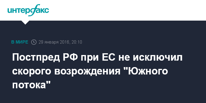 Москва. 29 января. INTERFAX.RU - Постпред РФ при Евросоюзе Владимир Чижов в эфире телеканала "Россия 24" допустил, что проект "Южный поток" может получить новое дыхание.