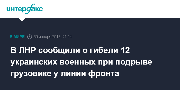 Москва. 30 января. INTERFAX.RU - Разведка народной милиции самопровозглашенной Луганской народной республики зафиксировала подрыв на фугасе грузовика с 12 украинскими военными в районе города Счастье, находящегося под контролем киевских властей.