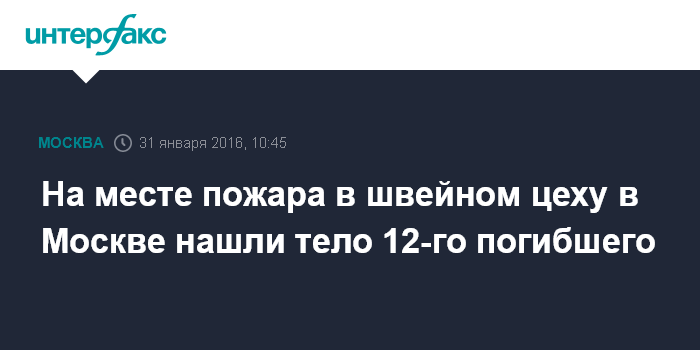 Москва. 31 января. INTERFAX.RU - В здании сгоревшего швейного цеха на улице Стромынка в Москве обнаружено тело 12-го погибшего, сообщил "Интерфаксу" в воскресенье источник в экстренных службах.