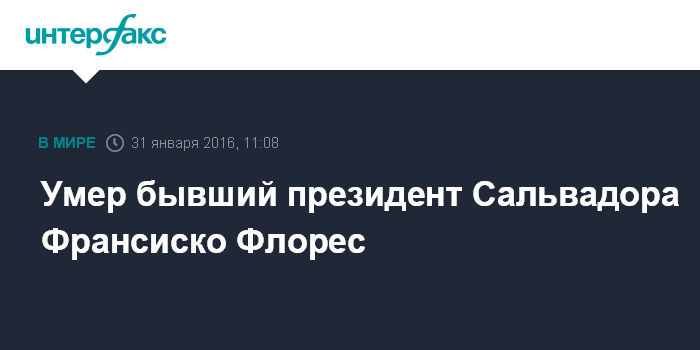 Москва. 31 января. INTERFAX.RU - Бывший президент Сальвадора Франсиско Флорес скончался в возрасте 56 лет в одной из больниц столицы этой страны, сообщает в воскресенье агентство The Associated Press.