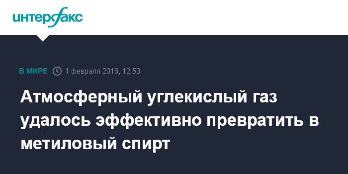 Москва. 1 февраля. INTERFAX.RU - Химикам из Университета Южной Калифорнии удалось конвертировать 79 процентов углекислого газа, извлеченного из атмосферного воздуха, в метиловый спирт, сообщает N+1 со ссылкой на публикацию в Journal of the American Chemical Society.