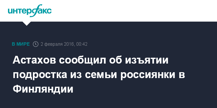 Москва. 2 февраля. INTERFAX.RU - Уполномоченный по правам ребенка в РФ Павел Астахов заявил об изъятии ребенка у семьи гражданки России в Финляндии.