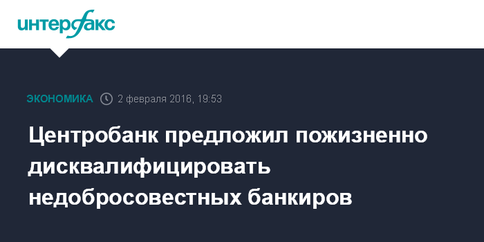 Москва. 2 февраля. INTERFAX.RU - ЦБ РФ выступает за пожизненную дисквалификацию недобросовестных банкиров в случае повторения ими грубых ошибок при управлении кредитной организацией, заявил журналистам зампред ЦБ Михаил Сухов.