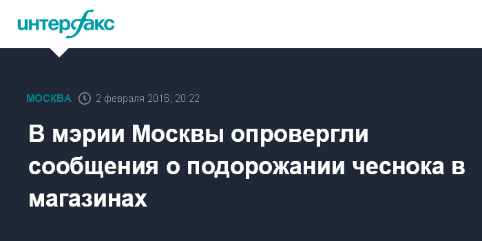 Москва. 2 февраля. INTERFAX.RU - В столичных магазинах чеснока в достаточном количестве и никакого резкого роста цен не было, заявил журналистам во вторник глава департамента торговли и услуг Москвы Алексей Немерюк.