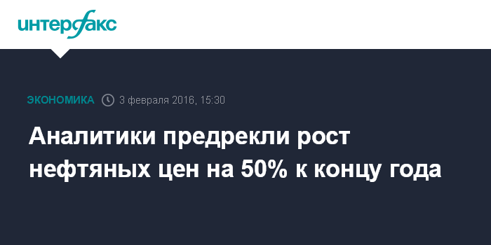 Москва. 3 февраля. INTERFAX.RU – Цены на нефть могут вырасти примерно на 50% в четвертом квартале 2016 года по сравнению с текущими котировками на фоне сокращения предложения и роста спроса, полагают аналитики, опрошенные агентством Bloomberg.