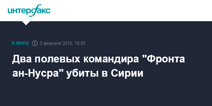 Москва. 3 февраля. INTERFAX.RU - Два полевых командира "Фронта ан-Нусра" (отделение "Аль-Каиды" в Сирии и Ливане, запрещено в РФ как террористическое) уничтожены в ходе боев с сирийскими войсками в провинции Алеппо, сообщает в среду сирийский Наблюдательный совет по правам человека.