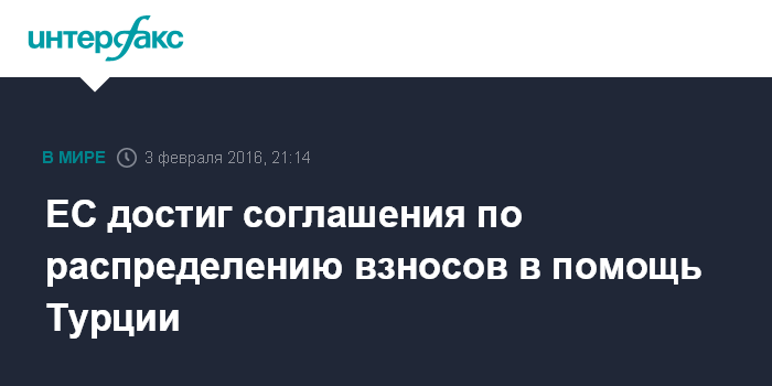 Москва. 3 февраля. INTERFAX.RU - Государства Европейского Союза в среду достигли соглашения о том, как разделить между собой выплату 3,3 млрд евро, которые обещаны Турции на урегулирование кризиса с беженцами, говорится в заявлении Европейской Комиссии.