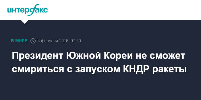 Москва. 4 февраля. INTERFAX.RU - Южная Корея рассматривает планируемый КНДР запуск искусственного спутника Земли как угрозу миру и безопасности не только на Корейском полуострове, но и в глобальном масштабе, с чем нельзя смириться, заявила южнокорейский президент Пак Кын Хе.