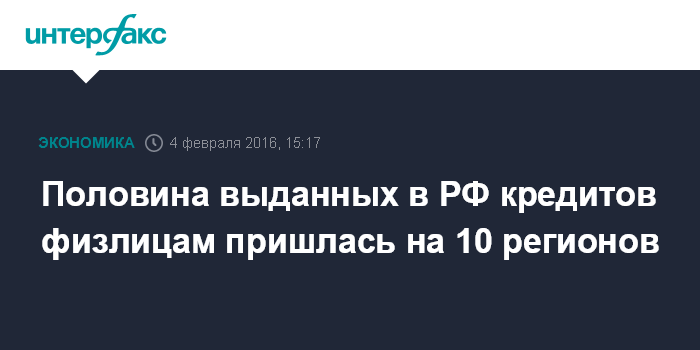 Москва. 4 февраля. INTERFAX.RU – Почти половина совокупного объема выданных в 2015 году в России розничных кредитов пришлась на десять регионов. Объем кредитных средств, полученных там физлицами, составил около 1,1 трлн рублей (при объеме около 2,4 трлн рублей во всей стране), свидетельствуют данные исследования Объединенного кредитного бюро (ОКБ).