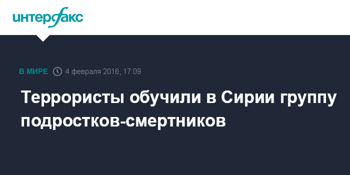 Москва. 4 февраля. INTERFAX.RU - Террористические организации подготовили в Сирии группу подростков-смертников для совершения террористических актов в стране, заявил официальный представитель министерства обороны России Игорь Конашенков.