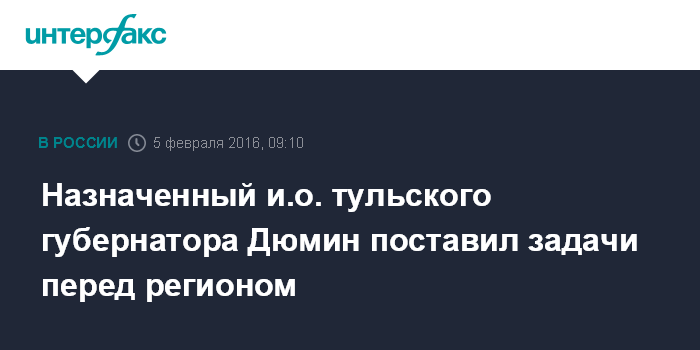 2 февраля президент России Владимир Путин принял отставку губернатора Тульской области Груздева, руководившего регионом с августа 2011 года, по его желанию и поручил исполнять обязанности руководителя региона до выборов Дюмину, занимавшему до этого момента пост заместителя министра обороны.
