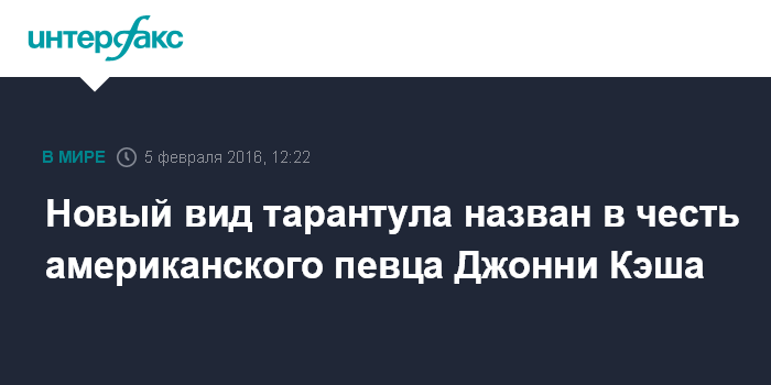 Москва. 5 февраля. INTERFAX.RU - Новый вид тарантула, обнаруженный на юге США, получил имя известного американского музыканта Джонни Кэша, сообщает BBC News.