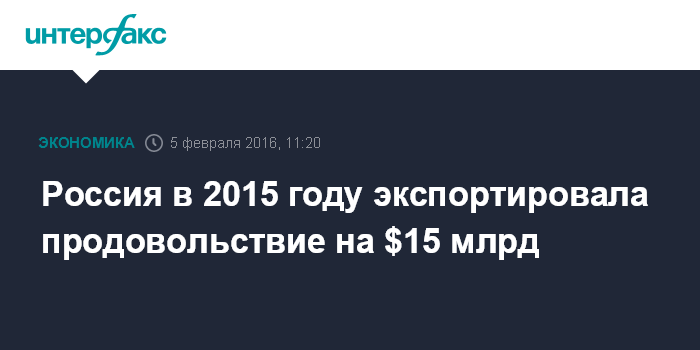 Москва. 5 февраля. INTERFAX.RU – Россия в 2015 году экспортировала сельхозсырья и продовольствия на $15 млрд против $20 млрд в 2014 году, сообщил министр сельского хозяйства РФ Александр Ткачев на съезде " Единой России" в пятницу в Москве.