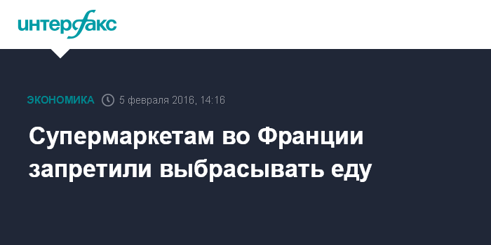 Москва. 5 февраля. INTERFAX.RU – Французский сенат в четверг единогласно принял закон, запрещающий супермаркетам страны выкидывать или утилизировать нераспроданные продукты питания до окончания срока годности, сообщает The Guardian.