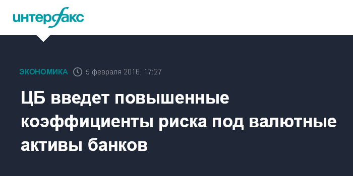 Москва. 5 февраля. INTERFAX.RU – Банк России намерен установить повышенные коэффициенты риска по валютным корпоративным кредитам и вложениям в долговые инструменты, номинированные в иностранной валюте, говорится в сообщении на сайте регулятора.