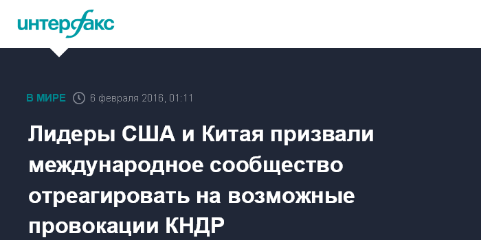 Москва. 6 февраля. INTERFAX.RU - Президент США Барак Обама и председатель КНР Си Цзиньпин в ходе телефонного разговора заявили о необходимости единой международной реакции на провокации КНДР, в том числе на планируемое Пхеньяном испытание баллистической ракеты, сообщает Белый дом.