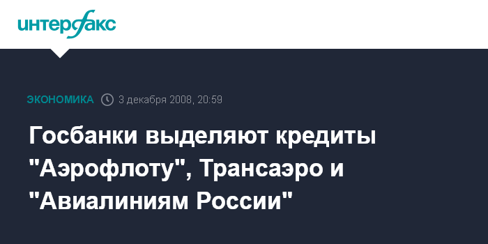 Москва. 3 декабря. INTERFAX.RU - Госбанки предоставляют кредитные средства для поддержания операционной деятельности трем российским авиакомпаниям - АО "Аэрофлот - российские авиалинии", АО "Трансаэро" и создающемуся холдингу "Авиалинии России" ("Росавиа"), сообщили агентству "Интерфакс" представители компаний.
