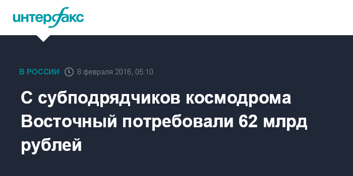 Москва. 8 февраля. INTERFAX.RU - Спецстрой намерен взыскать почти 62 млрд рублей с недобросовестных субподрядчиков космодрома Восточный. В судах рассматривается более тысячи исков, пишет 8 февраля "Коммерсантъ" со ссылкой на директора Спецстроя Александра Волосова.