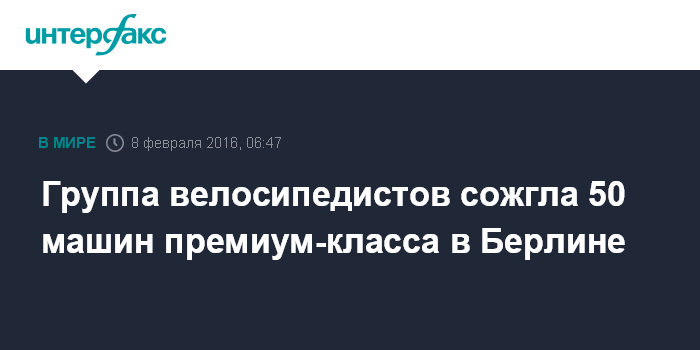 Москва. 8 февраля. INTERFAX.RU - Группа примерно из 50 человек на велосипедах атаковала припаркованные автомобили премиум-класса в Берлине. Как пишет Los Angeles Times, погромы прошли в знак несогласия с процессом джентрификации — переходом некогда недорогих районов города в категорию более престижных и, соответственно, ростом стоимости проживания в них.