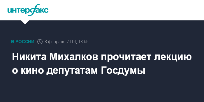 Москва. 8 февраля. INTERFAX.RU - Народный артист РСФСР, режиссер Никита Михалков 10 февраля прочтет лекцию в Госдуме, сообщает официальный сайт нижней палаты.
