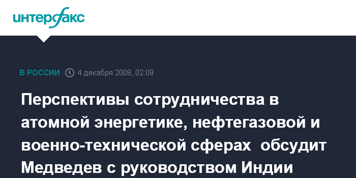 Перспективы сотрудничества в атомной энергетике, нефтегазовой и военно-технической сферах обсудит Медведев с руководством Индии