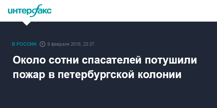 Москва. 9 февраля. INTERFAX.RU - Пожар на территории исправительной колонии под Петербургом вспыхнул вечером во вторник. Как сообщает пресс-служба ГУ МЧС по северной столице, в 21:35 на телефон "01" поступило сообщение о возгорании в посёлке Металлострой.