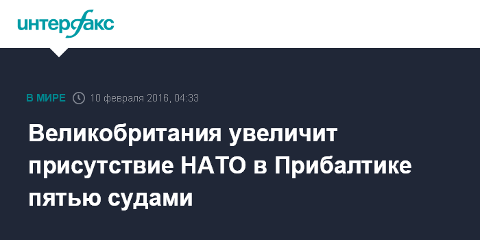 Москва. 10 февраля. INTERFAX.RU - Великобритания отправит пять военных кораблей в Балтийское море. Таким образом, пишет The Guardian, НАТО укрепляет свои позиции в регионе.