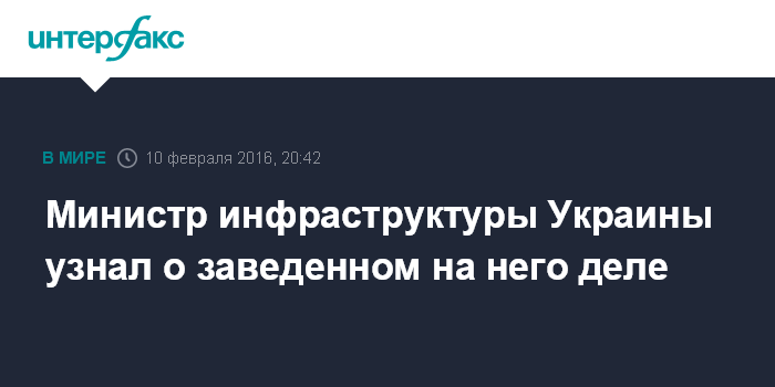 Москва. 10 февраля. INTERFAX.RU - Министр инфраструктуры Украины Андрей Пивоварский заявляет, что против него возбуждено уголовное дело, о чем он узнал в Национальном антикоррупционном бюро (НАБУ).