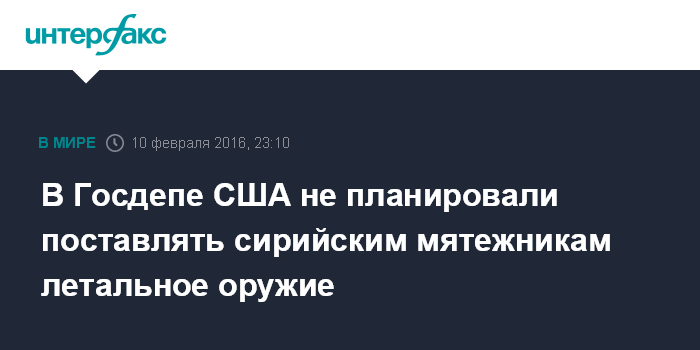 Москва. 10 февраля. INTERFAX.RU - США на данном этапе не принимали решение о поставках мятежникам, поддерживающим сирийскую оппозицию, летальных вооружений, заявил в среду представитель госдепа Марк Тонер.