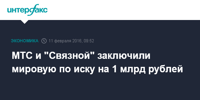 Москва. 11 февраля. INTERFAX.RU – Арбитражный суд Москвы в четверг утвердил мировое соглашение по иску АО "Связной Логистика" (основная операционная компания ритейлера "Связной") о взыскании с МТС и ее забайкальской "дочки" и ЗАО "Сибинтертелеком" примерно 1 млрд рублей за невыплату агентского вознаграждения. Производство по делу прекращено.