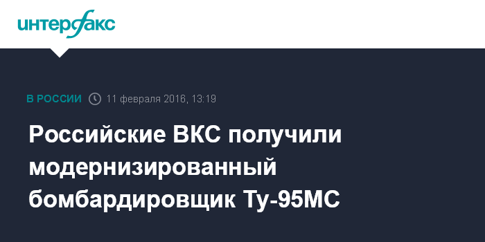 Москва. 11 февраля. INTERFAX.RU - Компания "Туполев" передала Воздушно-космическим силам России очередной модернизированный стратегический бомбардировщик Ту-95МС, сообщает пресс-служба Объединенной авиастроительной корпорации (ОАК).