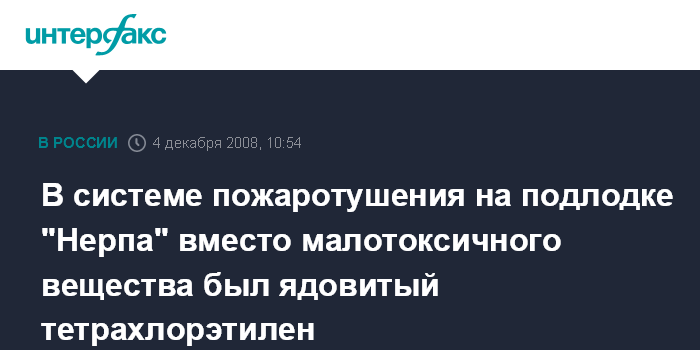 Москва. 4 декабря. INTERFAX.RU - В систему пожаротушения на атомной подлодке АПЛ "Нерпа", в результате срабатывания которой 8 ноября погибли 20 человек, на две трети была закачена примесь ядовитого вещества - тетрахлорэтилена, заявил главный инженер Амурского судостроительного завода (АСЗ) Александр Меринов со ссылкой на данные предварительного расследования инцидента.