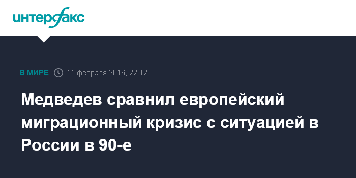 Москва. 11 февраля. INTERFAX.RU - Европа может столкнуться с проблемами, аналогичными тем, что имела Россия на Кавказе в 1990-х годах, если не найдет правильный подход к решению проблемы беженцев, считает премьер РФ Дмитрий Медведев.