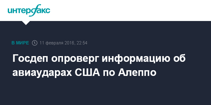 Москва. 11 февраля. INTERFAX.RU - Сообщения о том, что ВВС США недавно нанесли удары в районе сирийского города Алеппо, не соответствуют действительности, заявил в четверг представитель госдепа США Марк Тонер.