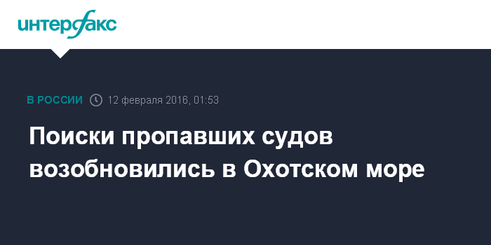Москва. 12 февраля. INTERFAX.RU - Поиски двух иностранных судов, пропавших в Охотском море, возобновились в пятницу с рассветом, сообщили "Интерфаксу" в Морском спасательном координационном подцентре Петропавловска-Камчатского Минтранса России.