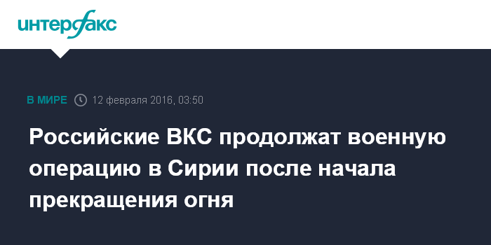 Москва. 12 февраля. INTERFAX.RU - Операция российских ВКС в Сирии против ИГИЛ, Джабхат-ан-Нусры и других террористических группировок (запрещены в РФ) продолжится после прекращения огня в Сирии, заявил глава МИД РФ Сергей Лавров.