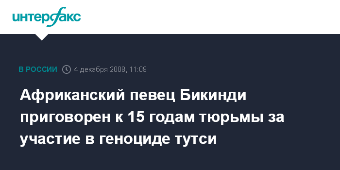 Москва. 4 декабря. INTERFAX.RU - Международный уголовный трибунал по Руанде признал известного африканского певца Симона Бикинди виновным в подстрекательстве к совершению актов геноцида и преступлений против человечности и приговорил его к 15 годам лишения свободы.