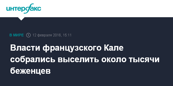 Москва. 12 февраля. INTERFAX.RU - Префектура французского города Кале в пятницу объявила о намерении выселить четверть жителей лагеря беженцев, сформировавшегося близ этого города, сообщает интернет-сайт французской газеты Le Figaro.
